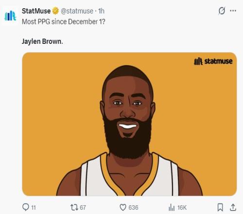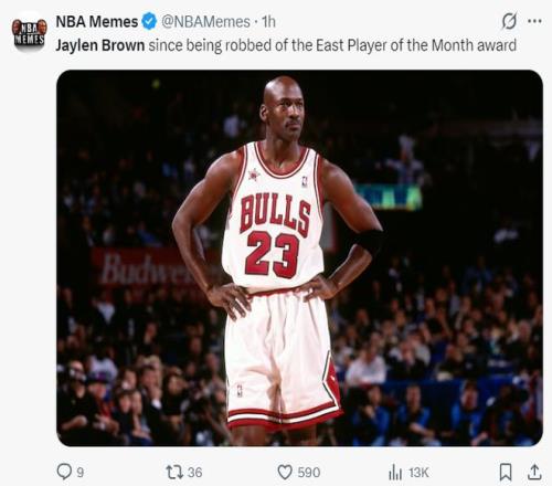 美媒NBA Memes寫道:當杰倫-布朗的月最佳球員被搶走后,他就化身邁克爾-喬丹了。