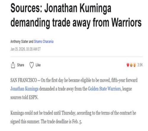 名記Shams在庫(kù)明加獲得交易資格第一天就曝出其團(tuán)隊(duì)已經(jīng)向勇士提出交易申請(qǐng),勇士也一直積極為其尋找下家。