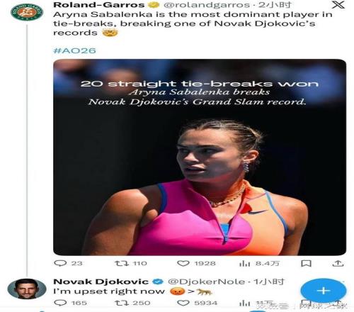 另一方面,女單世界第一薩巴倫卡在澳網(wǎng)期間實現(xiàn)了大滿貫搶七20連勝,打破了由德約科維奇保持的紀錄。賽后,在社交媒體上,得知此消息的德約科維奇在薩巴倫卡的動態(tài)評論區(qū)出現(xiàn),并表示“我現(xiàn)在很生氣”。