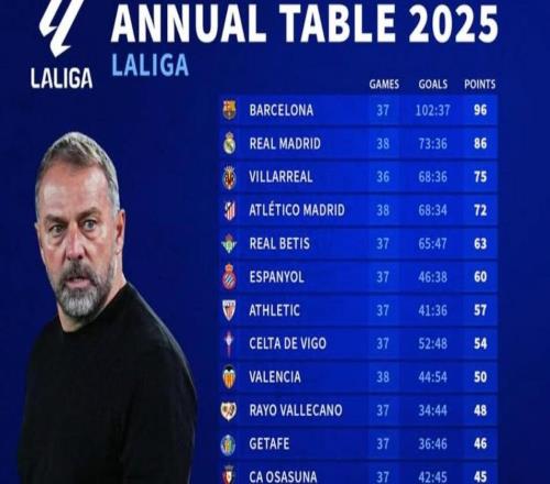 西甲2025年積分榜:巴薩96分第1,皇馬86分第2,馬競72分第4